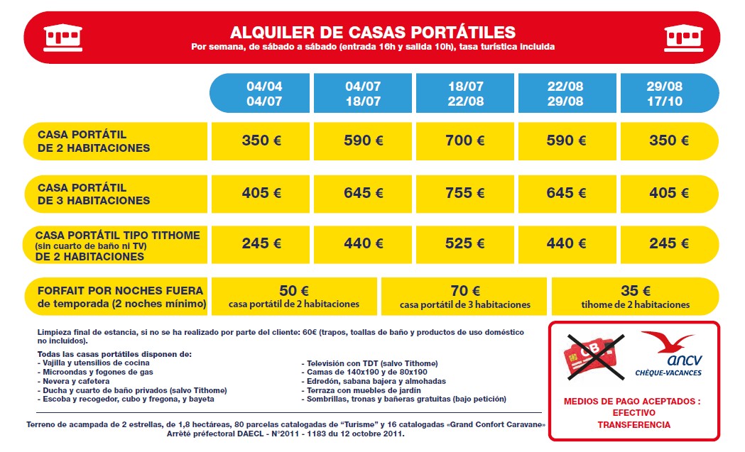Camping Calède ofrece el alquiler de casas portátiles de 2 o 3 dormitorios confortables, o una fórmula más económica en Tithome en parcelas perfectamente delimitadas, agradables y tranquilas.